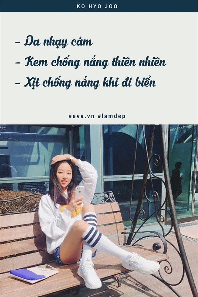Đối với người có làn da nhạy cảm như “nữ thần trượt ván” xứ Hàn Ko Hyo Joo, một lớp xịt chống nắng không bao giờ là đủ để bảo vệ da khỏi tác hại của ánh mặt trời. Cô nàng chuộng kem chống nắng của các thương hiệu mỹ phẩm thiên nhiên và xịt thêm một lớp nữa khi ở bãi biển. Cô cũng thích mặc kiểu áo dài tay với chất liệu lưới thoáng mát để chống nắng một cách tuyệt đối.