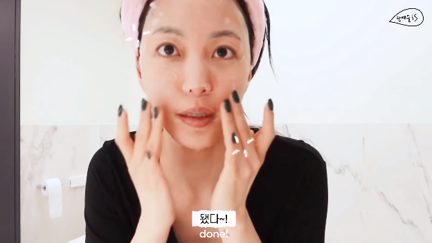 Sau khi lột miếng mặt nạ giấy, Han Ye Seul sẽ kết lại quy trình dưỡng da với essence, kem dưỡng ẩm và có được gương mặt mộc hoàn hảo như thế này.
