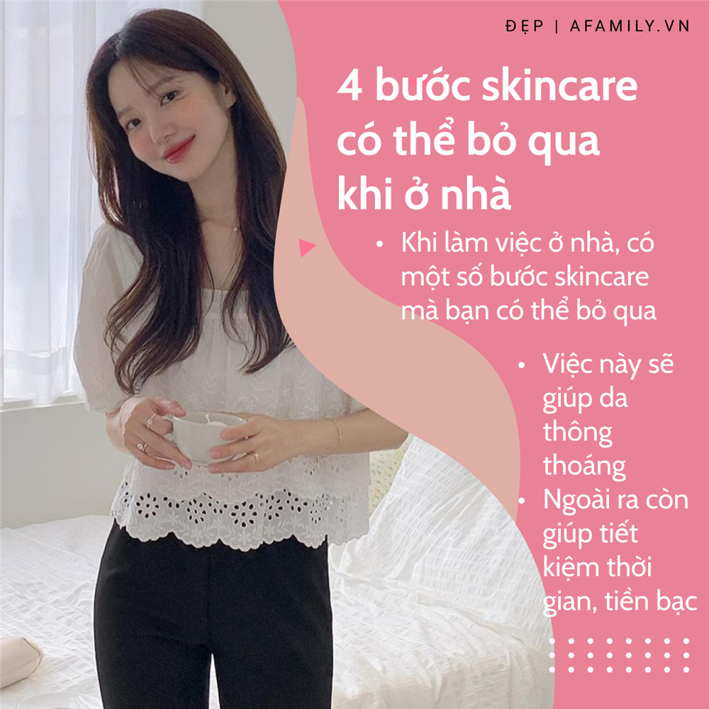 Ở nhà giãn cách vì tình hình dịch bệnh, chu trình dưỡng da ở nhà của các chị em cũng nên có sự thay đổi. Thực tế có 1 số bước skincare mà bạn có thể bỏ qua khi ở nhà, điều này sẽ giúp bạn tiết kiệm cả thời gian và tiền bạc đó nhé.