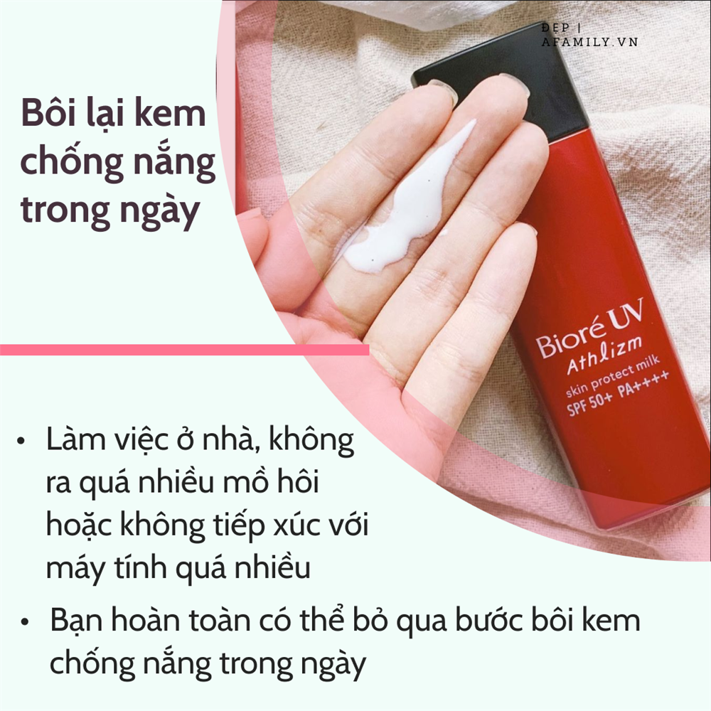 Khi làm việc ở nhà không ra quá nhiều mồ hôi, tiếp xúc với ánh nắng mặt trời quá nhiều thì bạn hoàn toàn có thể bỏ qua bước bôi lại kem chống nắng trong ngày.