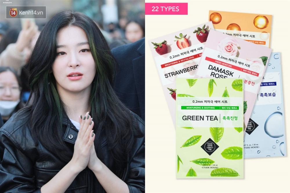 3. Seulgi – Etude House Therapy Air MaskSeulgi từng nhiều lần chia sẻ cô rất chăm đắp mặt nạ dưỡng da để da luôn mịn đẹp. Mặt nạ của Etude House là sản phẩm mà cô yêu thích, đặc biệt là dòng Therapy Air Mask. Mặt nạ mỏng 0,2 mm ôm sát lấy gương mặt, thành phần chia thành nhiều dòng có chứa các dưỡng chất thiên nhiên như nha đam, trà xanh, chanh, hoa anh đào, lựu, rau má… Mặt nạ không chứa các chất hóa học gây hại nên phù hợp với mọi loại da.
