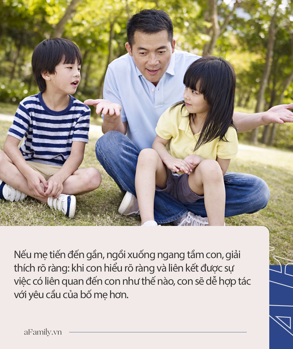 Thay vào đó, nếu mẹ tiến đến gần, ngồi xuống ngang tầm con, giải thích rõ ràng: "Bình hoa này rất nặng, con ôm thử xem, nếu con sơ ý làm bình hoa rơi xuống đất vỡ, mảnh vỡ có thể cắt vào chân làm con đau và chảy máu, nên con đừng chơi quanh chỗ này nữa nhé!" – khi con hiểu rõ ràng và liên kết được sự việc có liên quan đến con như thế nào, con sẽ dễ hợp tác với yêu cầu của bố mẹ hơn.