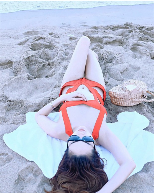 Vẫn là bối cảnh và bộ bikini đó, Minh Hằng chỉ cần đối diện với camera và hơi nghiêng đi ánh nhìn là chiếc cằm lại trông rất tự nhiên. Nét ‘”Bé Heo” một thời thấp thoáng trong bức ảnh này.