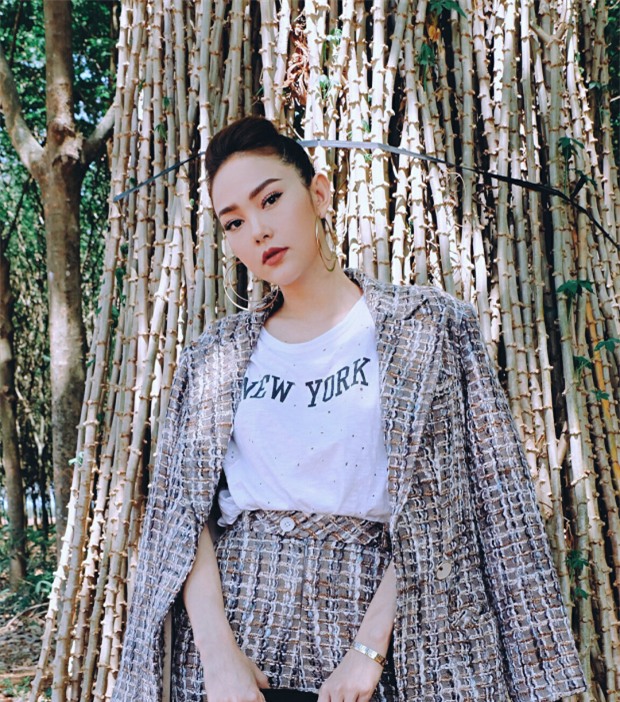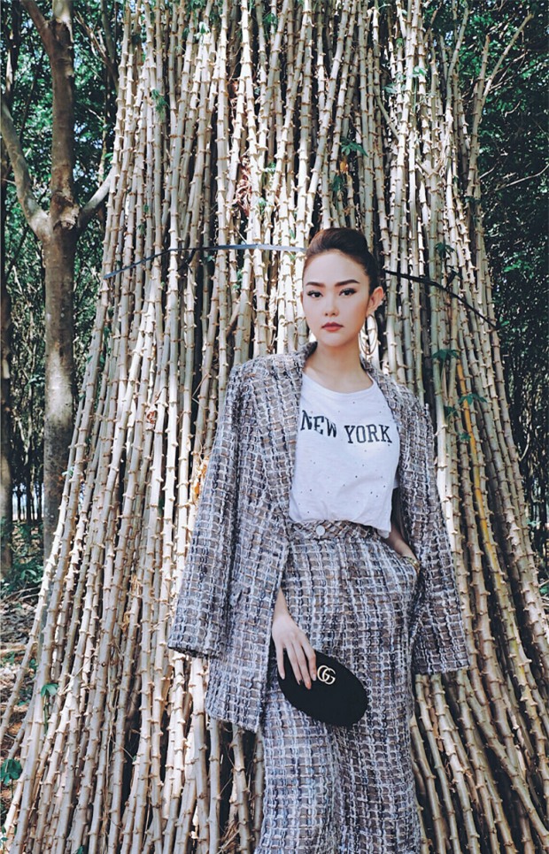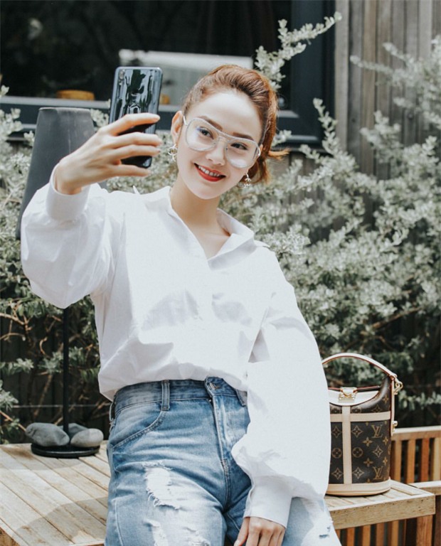 Chụp từ trên xuống thế này giúp gương mặt Minh Hằng ra dáng “trái xoan” hơn. Đặc biệt, đôi kính đen đã che đi đôi mắt và một phần gương mặt nên không để lộ dấu vết nhân tạo trên gương mặt cô ca sĩ.