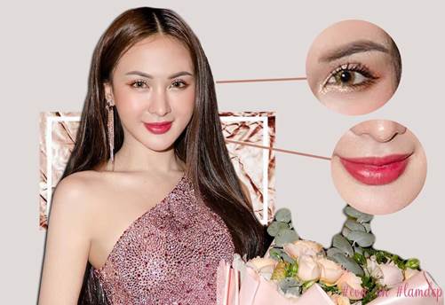 Kelly Nguyễn tỏa sáng trong bữa tiệc sinh nhật của chính mình nhờ đôi mắt được phủ nhũ lấp lánh, eyeliner pha phấn nâu độc đáo và màu son môi cũng lạ không kém.