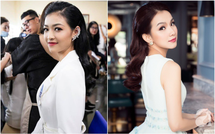 Cô nàng Kiều Loan lại có đường nét khá giống HH Thùy Lâm với nụ cười tươi, trán cao. Cả 2 đều yêu thích kiểu tóc búi cao hôi đánh phồng phần chân tóc để tôn lên đường nét thanh tú, thông minh.