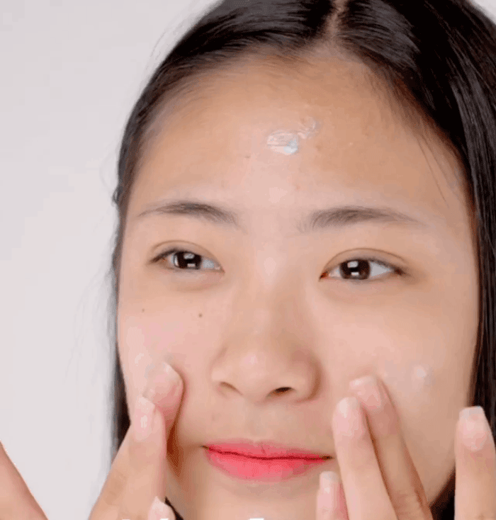 Đầu tiên bạn lấy 1 lượng kem vừa đủ, chấm lên da thành năm điểm: trán, cằm, mũi và 2 bên má...