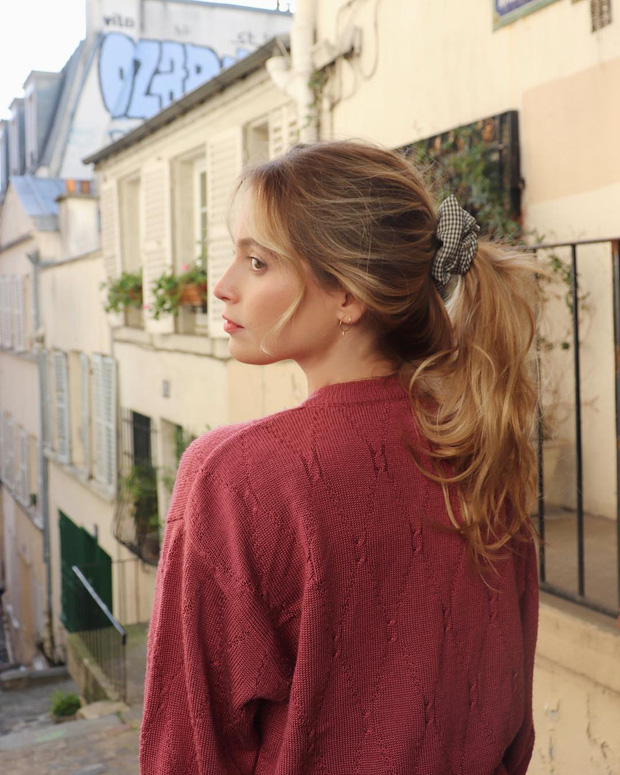 Để nâng tầm cho kiểu tóc buộc đuôi ngựa thân thuộc, phụ nữ Pháp sẽ cố định mái tóc bằng khăn hay chun buộc vải bồng bềnh, và thế là vẻ ngoài sẽ toát lên nét bay bổng, tao nhã, cực kỳ cuốn hút người nhìn, chụp ảnh sống ảo thì xinh phải biết. Chưa hết, tóc buộc đuôi ngựa, nhấn nhá chun buộc tóc vải còn giúp chủ nhân "hack" tuổi hiệu nghiệm.
