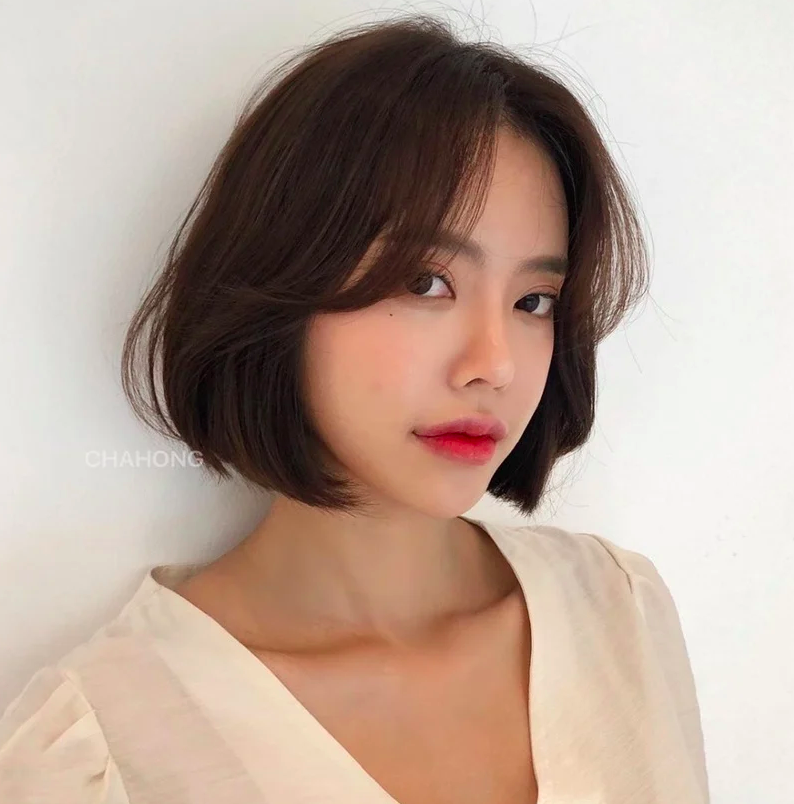 Kiểu mái hợp nhất với nàng trán cao dô mặt tròn đầy đặn, phần tóc uốn phồng hai bên che bớt một phần gương mặt, giúp phần trán dô như hài hòa, cân đối hơn. Một kiểu tóc mái che nhược điểm khuôn mặt lợi hại nhất mà bạn từng biết.