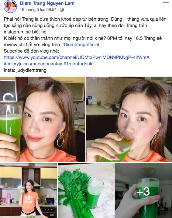Diễm Trang chia sẻ, cô cảm nhận rõ rệt sự thay đổi của cơ thể và làn da chỉ sau vài ngày duy trì uống nước ép cần tây. Cô còn có hẳn một clip riêng thử thách bản thân với 7 ngày detox bằng nước ép cần tây, chia sẻ tất tần tật những cảm nhận từ ngày đầu tiên đến khi nhận thấy cơ thể có sự biến đổi tích cực sau 1 tuần.
