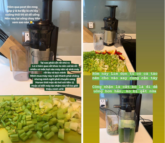 Cũng giống như Á hậu Diễm Trang, Thủy Anh cũng chia sẻ nếu bỏ lá đi và chỉ ép mỗi bẹ cây cần tây thì sẽ dễ uống hơn nhiều. Hai vợ chồng không mix cùng các loại rau quả khác mà chỉ uống nước nguyên chất mỗi ngày.