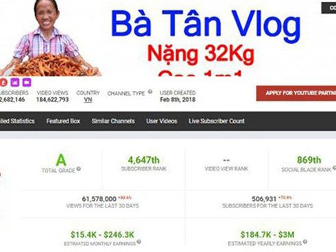 Bà Tân Vlog (tên thật Nguyễn Thị Tân - 58 tuổi, Bắc Giang) là một trong những YouTuber nổi tiếng nhất tại Việt Nam. Người phụ nữ này trở thành một hiện tượng mạng khi sở hữu kênh Bà Tân Vlog lọt vào top 3 kênh YouTube đạt nút vàng (1 triệu người theo dõi chỉ sau 60 ngày) nhanh nhất thế giới.Ngày 7/6, kênh Bà Tân Vlog chính thức được bật chức năng kiếm tiền đã thu hút sự quan tâm của nhiều người. Kể từ khi được YouTube bật chức năng kiếm tiền, mức thu nhập của bà luôn là điều khiến nhiều người tò mò, quan tâm.