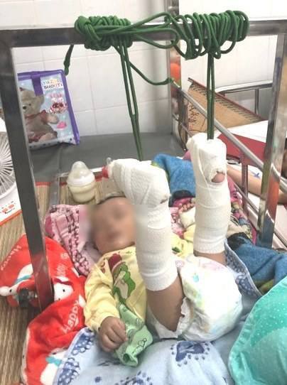 Theo bác sĩ, cháu K. phải treo chân 2 - 3 tuần nữa rồi mới bó bột.