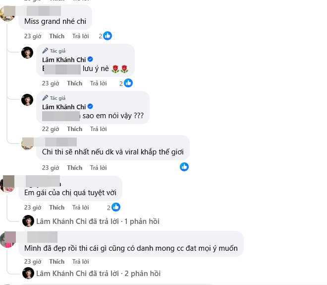 Trong đó, một cư dân mạng để lại bình luận: "Miss Grand nhé chị". Lâm Khánh Chi lập tức phản hồi: "Lưu ý nè".