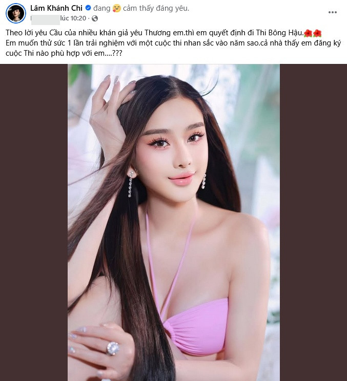 Cụ thể, Lâm Khánh Chi viết: "Theo lời yêu cầu của nhiều khán giả yêu thương em thì em quyết định đi thi Bông Hậu. Em muốn thử sức 1 lần trải nghiệm với một cuộc thi nhan sắc vào năm sau, cả nhà thấy em đăng ký cuộc thi nào phù hợp với em?"