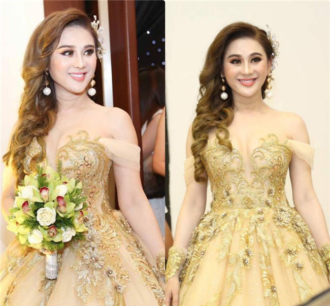 Váy cưới màu vàng ánh kim là một trong những chiếc váy cưới thiết kế riêng cho "Nữ hoàng chuyển giới" trong ngày trọng đại được đính hàng nghìn viên pha lê được nhập khẩu từ Cộng hòa Czech.