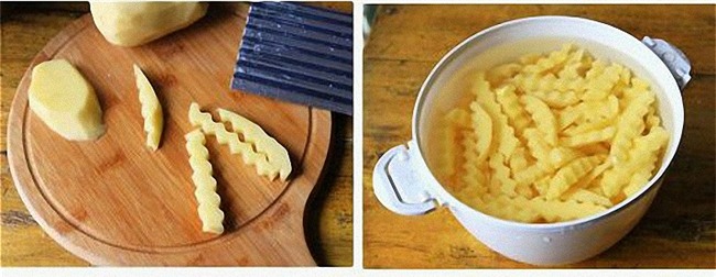 Khoai tây rửa sạch, gọt vỏ sau đó dùng dao cắt sợi dài. Nên sử dụng loại dao răng cưa để thái khoai vì gia vị sẽ thấm đều vào khoai tây nên ngon hơn.
