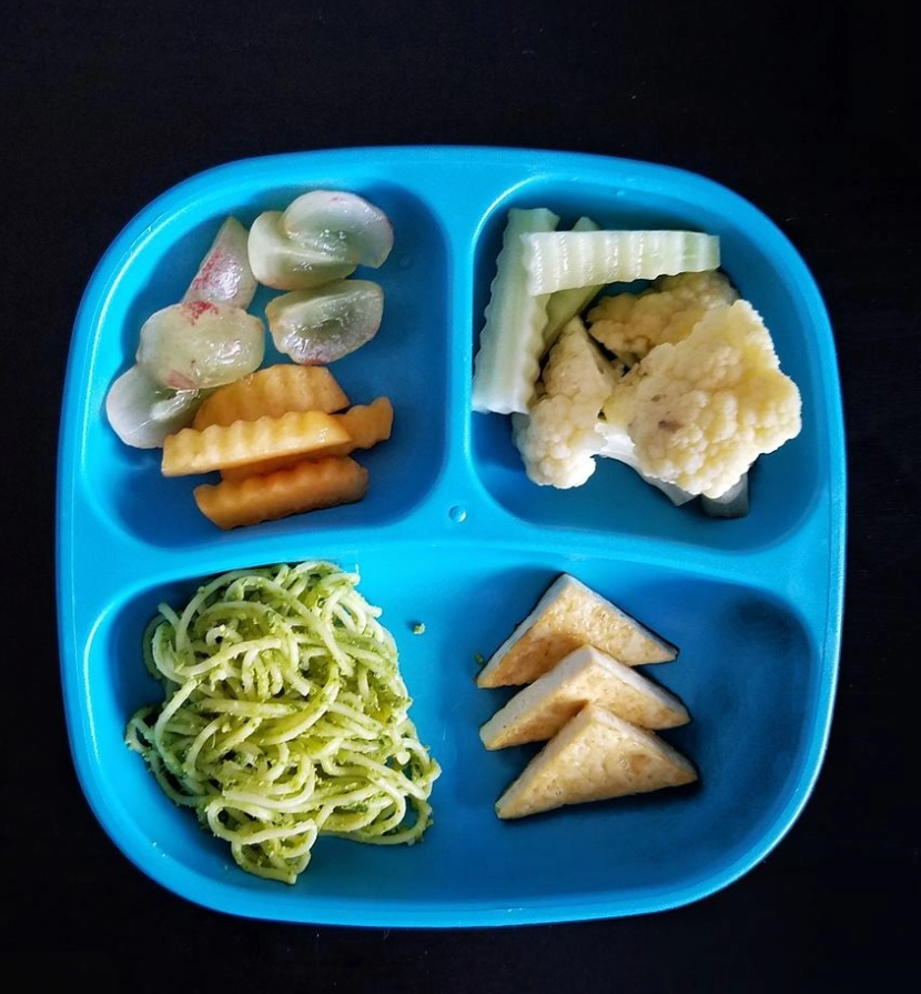 Mì sốt ra, đậu phụ áp chảo, bông cải + susu hấp, tráng miệng mận và nho