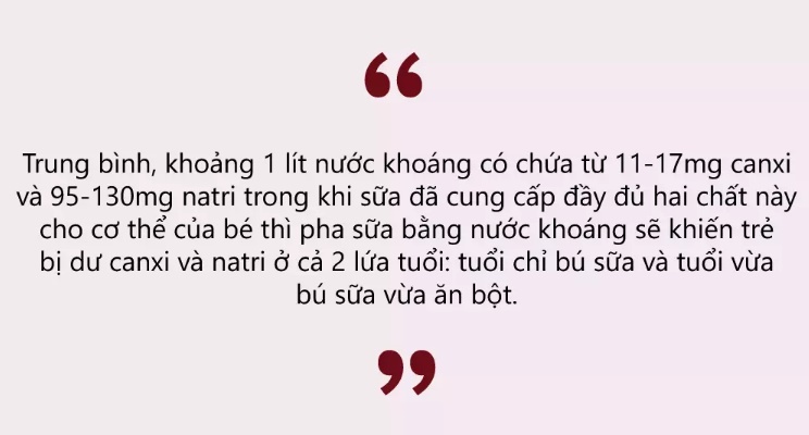 Một lưu ý quan trọng hơn chính là không nên dùng nước khoáng để pha sữa bột cho trẻ. Bởi, trung bình khoảng 1 lít nước khoáng có chứa từ 11-17mg canxi và 95-130mg Natri trong khi sữa đã cung cấp đầy đủ hai chất này cho cơ thể của bé thì pha sữa bằng nước khoáng sẽ khiến trẻ bị dư canxi và natri ở cả 2 lứa tuổi: tuổi chỉ bú sữa và tuổi vừa bú sữa vừa ăn bột.
