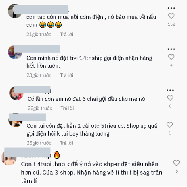 Ngoài đồ chơi, dây buộc tóc, lego… nhiều bạn nhỏ còn đặt những đồ có giá trị lớn. Các bạn còn đặt nồi cơm điện, ô tô điện trẻ em, thậm chí là chiếc tivi có giá lên đến 14 triệu đồng. Nhiều người kịp thời phát giác khi đơn hàng đang chuẩn bị hoặc trên đường vận chuyển kịp thời hủy đơn. Nhưng có nhiều người đến lúc shipper gọi lấy đồ mới tá hỏa thì đã muộn.