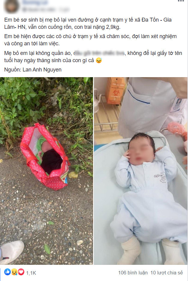 "Em bé sơ sinh bị mẹ bỏ lại ven đường ở cạnh trạm y tế xã Đa Tốn - Gia Lâm- Hà Nội, vẫn còn cuống rốn, con trai nặng 2,9kg.