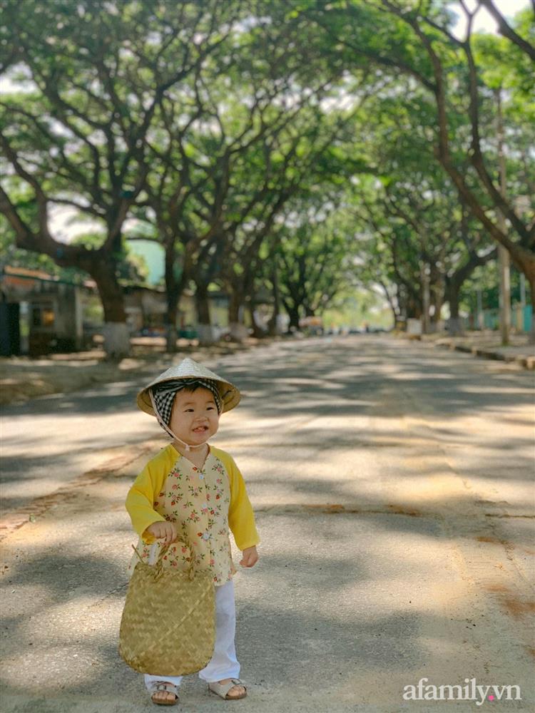 Bộ ảnh bé Gem - 14 tháng tuổi mặc quần áo bà ba, đội mũ rằn, nón lá, chân đi dép tổ ong xách làn đi chợ trông cực ngộ nghĩnh.