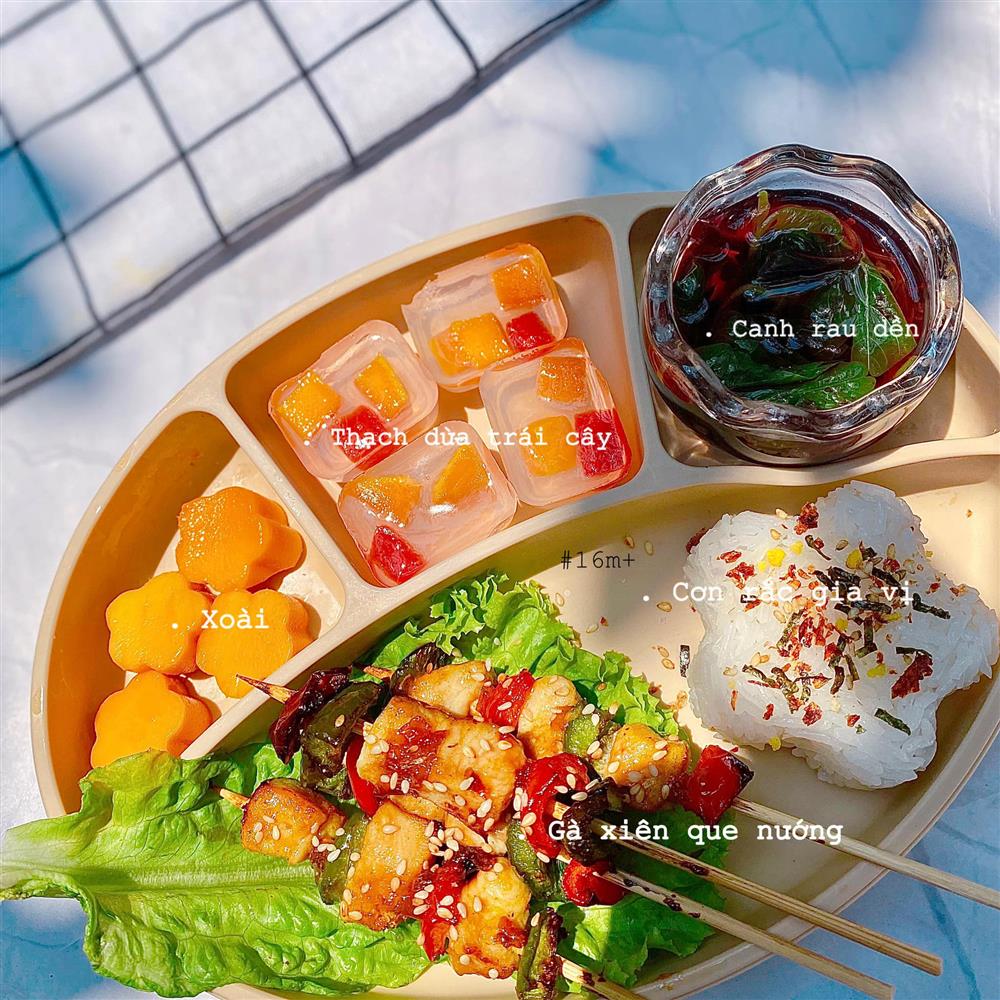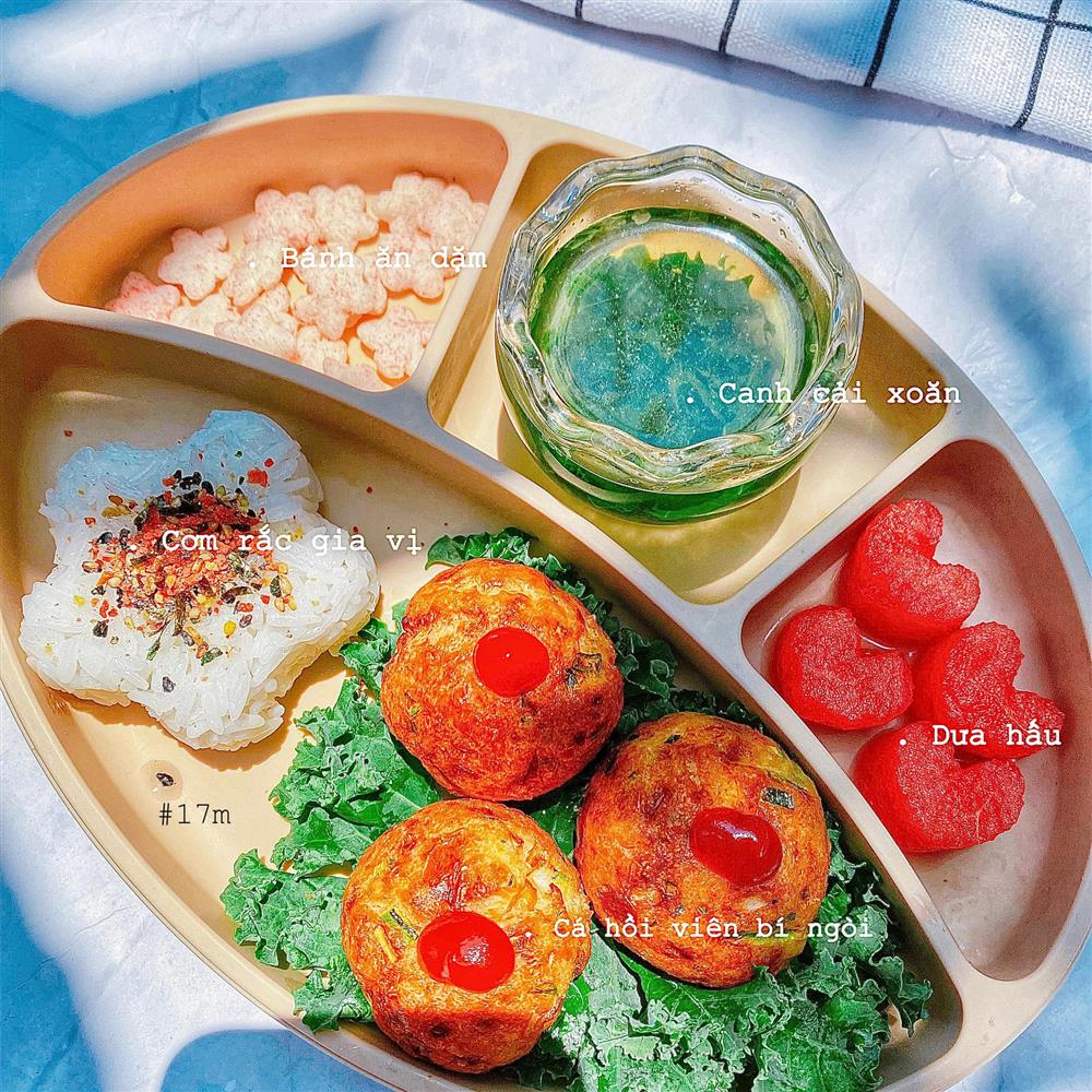 Mỗi bữa ăn của con đều được mình đảm bảo đủ 4 nhóm: tinh bột, đạm, béo và vitamin. Bên cạnh đó mình cũng thế biến các món nhiều màu sắc để hấp dẫn bé hơn. Việc trang trí món ăn không quá khó. Một số mẫu mình tham khảo trên mạng, có mẫu tự nghĩ ra. Các chi tiết trên đĩa cơm đa phần được nặn bằng tay, chi tiết khó mới dùng khuôn.