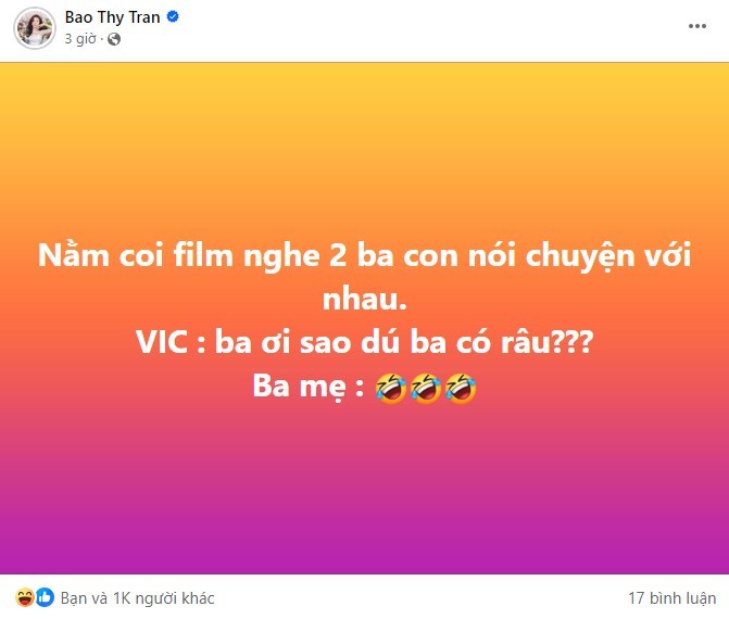 Theo đó, cậu nhóc Vic chắc chắn đã quan sát từ rất lâu nhưng không hiểu nên đã hỏi bố "Ba ơi sao vú ba có râu?". Bảo Thy đã dùng biểu cảm mặt "khóc cười" để thể hiện cho gương mặt vợ chồng cô lúc nhận được câu hỏi của con trai.