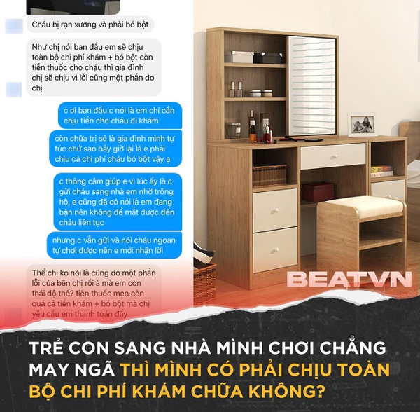 Em thấy hơi vô lý nên có nói lại và lúc ấy thì chị cáu nhặng lên bảo em thái độ. Ngay từ đầu em có nói em bận nên không để mắt đến cháu được nhưng chị vẫn gửi và em cũng không nghĩ là cháu lại trèo leo hẳn lên bàn phấn của em rồi nhảy xuống để ra cơ sự thế.