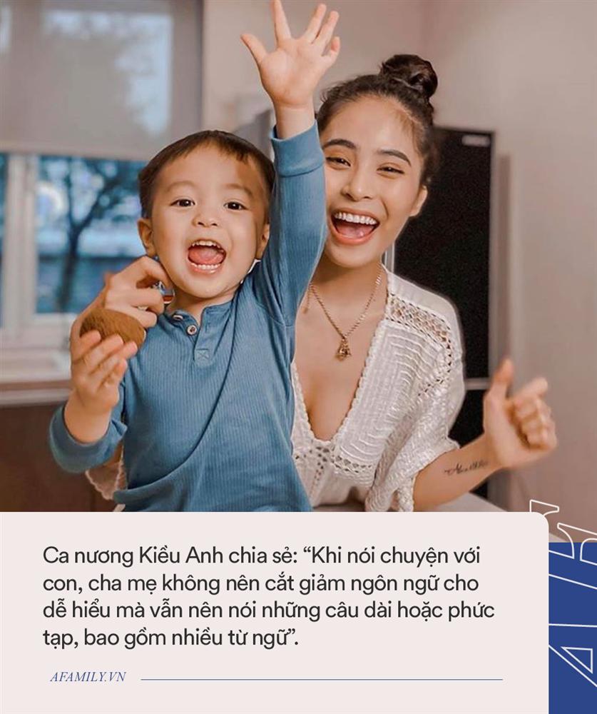 Để dạy con thông minh và nhanh biết nói, Kiều Anh thường xuyên trò chuyện, trao đổi với con khi ở nhà. Cô cho biết khi nói chuyện với con, cha mẹ không nên cắt giảm ngôn ngữ cho dễ hiểu mà vẫn nên nói những câu dài hoặc phức tạp, bao gồm nhiều từ ngữ. Ca nương tin rằng não bộ của các bé trong 3 năm đầu đời sẽ tiếp nhận được hết những thông tin này.
