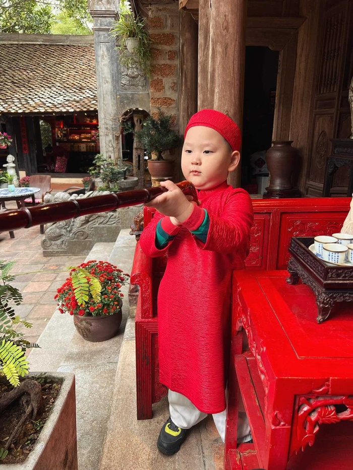 Trên trang cá nhân, nữ ca sĩ hào hứng khoe ảnh bé Gia Hy và Gia Hưng cùng mặt áo dài. Trong khi Gia Hy diện một chiếc áo dài màu be thì Gia Hưng mặc áo dài đỏ nổi bật. Cả 2 anh em đều đội mấn trùng với màu áo dài, thoải mái tạo dáng chụp ảnh.