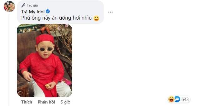 Không những vậy, bà mẹ 2 con còn "bóc phốt" con trai Gia Hưng rằng: "Phú ông này ăn uống hơi nhiều". Kèm theo đó là những bức ảnh cậu bé đang ăn bánh, uống trà rất tự nhiên. Sự hồn nhiên của Gia Hưng mang đến không khí vui vẻ, hài hước cho những người yêu mến gia đình Trà My Idol.