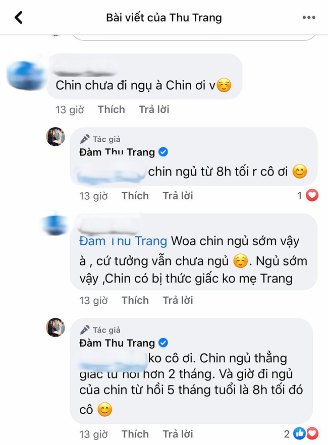 Đặc biệt, để giải đáp thắc mắc của mọi người bà xã Cường Đô La đã nhanh chóng trả lời bé Chin đã đi ngủ từ 8h tối rồi cơ. Đồng thời, mẹ Trang cũng tiết lộ thêm bé Chin đã ngủ thẳng giấc từ khi hơn 2 tháng tuổi rồi. Và giờ đi ngủ của con là 8 giờ tối từ khi 5 tháng tuổi cho đến hiện tại.