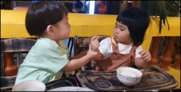 Mới đây, clip bé Bão liên tục cầm tay, lấy đồ ăn cho bé Táo - con gái nghệ sỹ Tự Long cũng được Hồng Nhung chia sẻ và nhận được nhiều quan tâm.