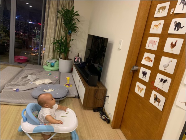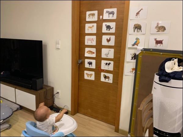 Là bà mẹ trẻ hiện đại, Ngọc Hương rất quan tâm đến sự phát triển cả về thể chất và trí tuệ cho con. Chính vì vậy, cô dành một "góc học tập" nhỏ trong nhà để dán các hình ảnh con thú, các loại quả để con tập làm quen với môi trường xung quanh. Dù chưa đầy 1 tuổi nhưng đây là giai đoạn rất quan trọng để con trẻ nhận biết được sự vật qua hình ảnh đơn giản và âm thanh. Phương pháp học qua hình ảnh này rất hiệu quả được nhiều bà mẹ áp dụng cho các bạn nhỏ.