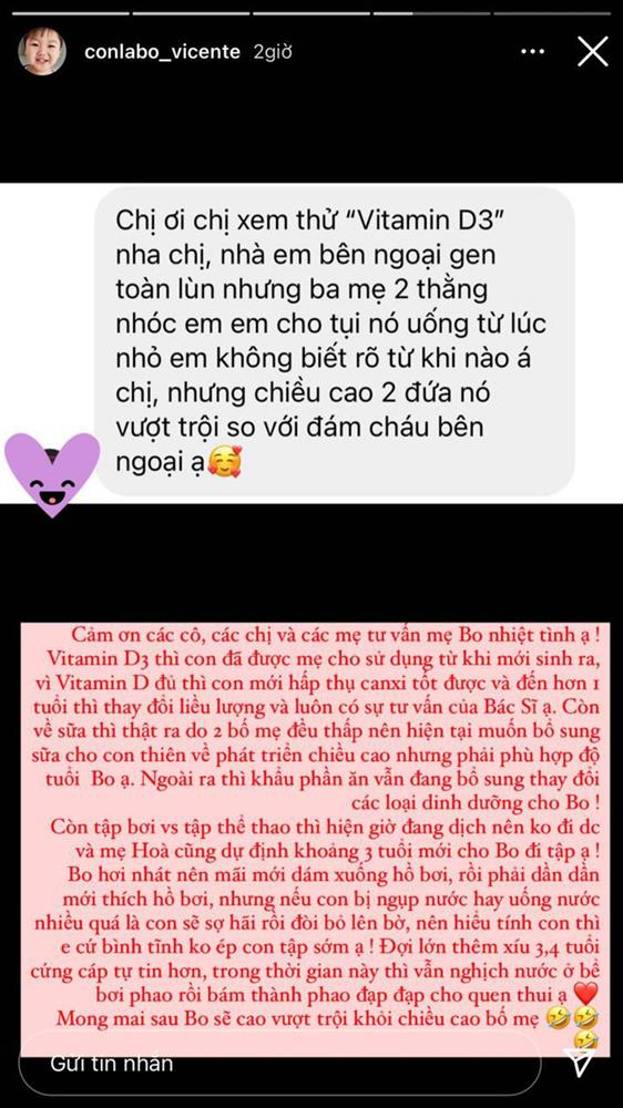 Ngoài ra thì khẩu phần ăn của bé vẫn đang bổ sung thay đổi các loại dinh dưỡng cho Bo" - Hòa Minzy tiết lộ.