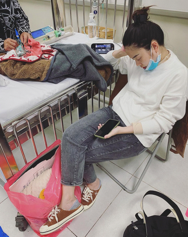 Cảnh vợ chồng Hằng Túi thay nhau thức đêm trông con tại bệnh viện khiến nhiều người thực sự cảm động và khâm phục cô.