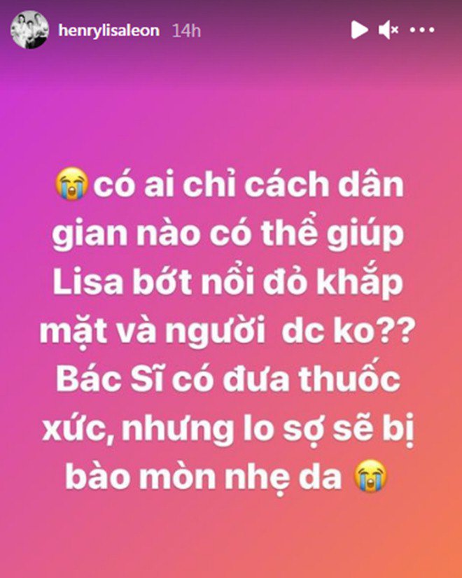 Trước đó, Hồ Ngọc Hà đã đăng đàn lên xin ý kiến dân tình về việc bé Lisa nổi mẩn đỏ trên mặt và người: "Có ai chỉ cách dân gian nào có thể giúp Lisa bớt nổi đỏ khắp mặt và người được không? Bác sĩ có đưa thuốc xức, nhưng lo sợ sẽ bị bào mòn nhẹ da" - Hồ Ngọc Hà viết.