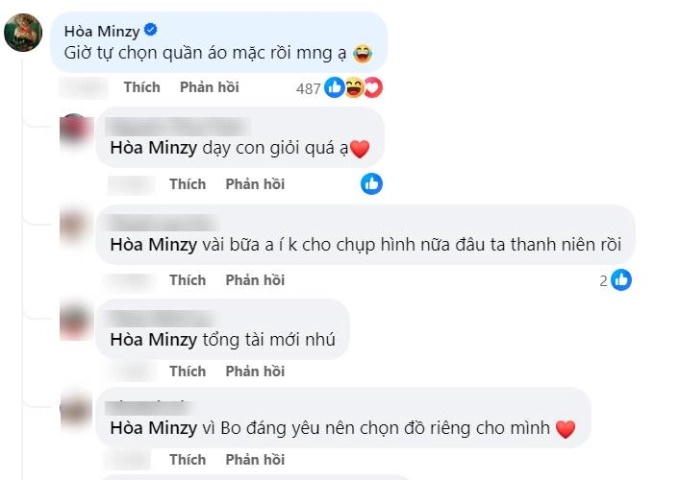 Thời gian gần đây, khi đăng tải một bức ảnh của bé Bo điển trai đang bước lên ô tô, Hòa Minzy không quên bình luận thêm dưới bài đăng: "Giờ tự chọn quần áo mặc rồi mọi người ạ". Chia sẻ của nữ ca sĩ nhận về gần 500 lượt yêu thích. Nhiều người để lại lời khen cô dạy con khéo: "Dạy con giỏi quá ạ"; "Con người ta tuổi này vẫn còn phụ thuộc bố mẹ lắm. Bo tự lập mà mẹ cũng biết tôn trọng Bo nữa"... vài người để lại bình luận.