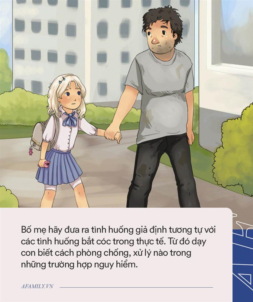 Một trong những cách hiệu quả để giúp con an toàn khỏi những kẻ bắt cóc là cùng con chơi trò nhập vai. Cụ thể bố mẹ hãy đưa ra những tình huống giả định gần giống với tình huống thực tế. Chẳng hạn như: "một người lạ hỏi con có muốn đi nhờ không", "người lạ tự xưng là người quen, bạn bè của bố mẹ", "người lạ muốn nhờ con giúp đỡ", "người lạ đưa đồ ăn cho con",...