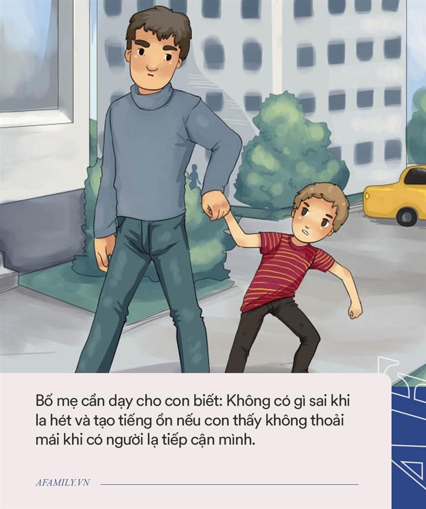 Dạy cho con không tương tác với người lạ là bài học vô cùng quan trọng. Bố mẹ cần dạy cho con biết: Không có gì sai khi la hét và tạo tiếng ồn nếu con thấy không thoải mái khi có người lạ tiếp cận mình. Dạy con nói "Không", chạy, la lên và nói với người khác nếu con cảm thấy đang gặp nguy hiểm hoặc khó chịu.
