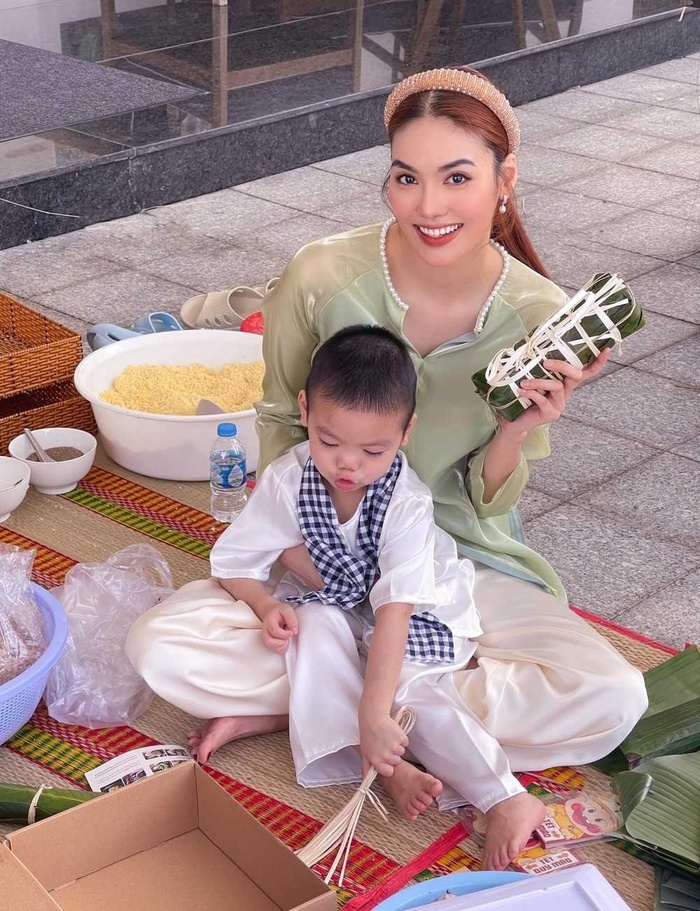 Trong khi người đẹp diện đồ bà ba màu xanh pastel đính ngọc trai trông vô cùng sang trọng thì quý tử được trưng diện trang phục màu trắng đính kèm khăn truyền thống của Việt Nam. Có thể thấy là cả hai mẹ con Lan Khuê đều rất hào hứng với hoạt động đặc biệt dịp gần Tết này. Trong một khung ảnh khác, "thiếu gia hào môn" còn nhanh nhẹn vác đòn bánh tét để mang đi luộc.