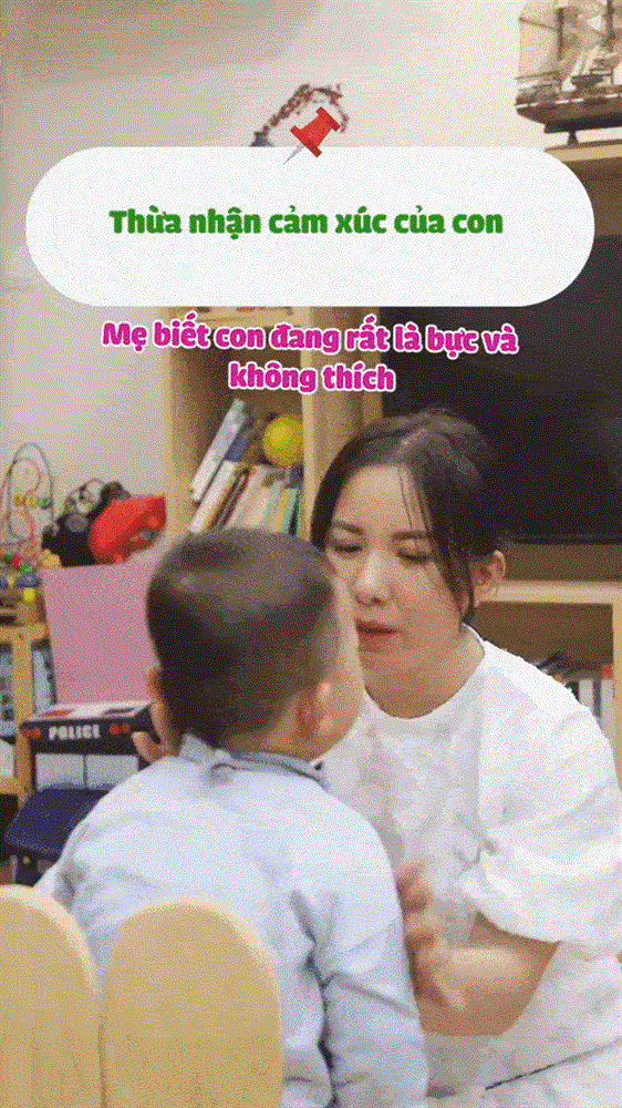 Quan sát suốt đoạn clip, khi con trai đang giận, chị Trang không đi ra chỗ khác mà liên tục ngồi xuống bằng vai với bé, dỗ dành và lắng nghe con. Thêm vào đó bà mẹ trẻ cũng không bực dọc quát tháo mà để con được nói ra những cảm xúc của mình. Sẽ mất một khoảng thời gian dài nhưng đây là lúc bạn học cách làm mẹ kiên nhẫn.
