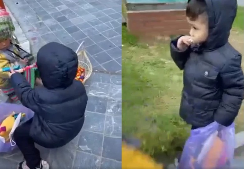 Hành động sau đó của cậu mới đáng kinh ngạc! Đứa nhóc 3 tuổi tưởng như chưa hiểu chuyện ấy đã kéo tay mẹ vào cửa hàng gần đó, mua rất nhiều kẹo bánh rồi tự tay đi chia cho các bạn nhỏ bán hàng rong mà cậu gặp trên đường.