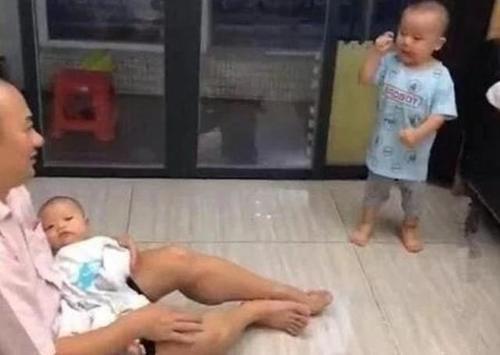 Hình ảnh cho thấy ông bố đang ngồi ôm ấp và dỗ dành đứa con gái vài tháng tuổi ở phòng khách. Đột nhiên lúc này cậu con trai 3 tuổi xuất hiện. Đứa trẻ tỏ ra rất tức giận khi thấy bố ôm và cưng em gái.