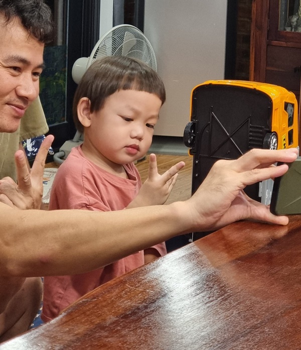 Mới đây nhất, trên trang cá nhân của mình Hồng Nhung chia sẻ đoạn nói chuyện ngắn của Bão khi mở tivi bằng cách nhận diện giọng nói khiến ai cũng thú vị. Bão mới 3 tuổi, đang trong gia đoạn tập nói nên phát âm còn chưa chuẩn nên nói chuyện bố mẹ thường phiên dịch hộ. Giọng nói ngọng líu lô nhưng vẫn rất đáng yêu của bé Bão quả thật rất hài hước, xứng danh con "bố Núi".