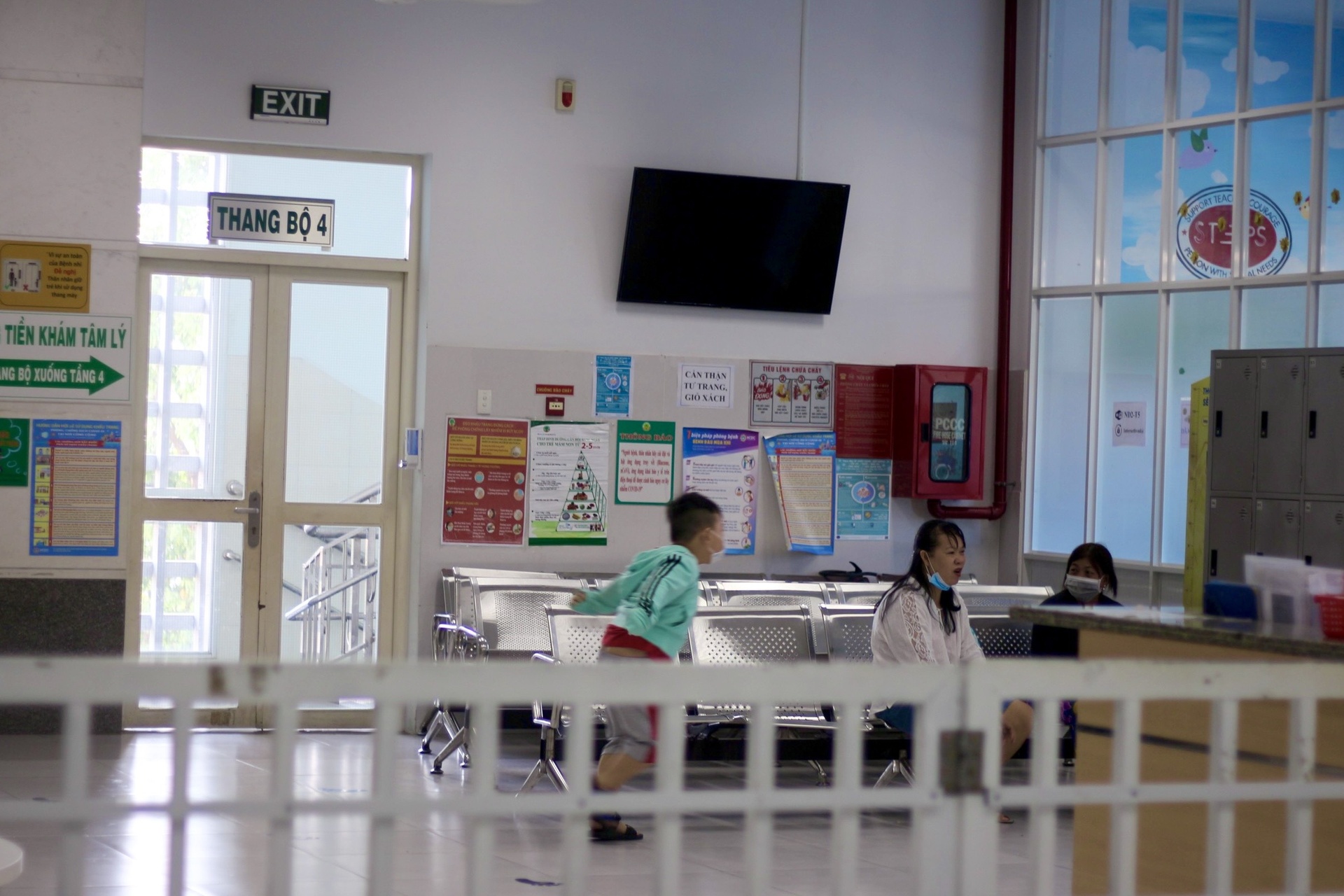 Một bé trai cùng mẹ chờ lượt khám tại khoa Tâm lý, Bệnh viện Nhi đồng 2. Ảnh: Bích Huệ.