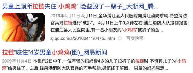 Trước đó, ở Trung Quốc cũng từng có tin tức về một cậu bé 12 tuổi phải tới bệnh viện vì bộ phận sinh dục cũng bị dây kéo khóa kẹ cuốn vào. Nghiêm trọng hơn là ngay cả các bác sĩ cũng đành bất lực và cuối cùng những người lính cứu hỏa đã phải lấy ra một đống dụng cụ cứu hộ như kéo, vise, kìm nhọn, kìm cắt chéo và phải mất nhiều công sức mới nới được dây kéo bị kẹt.