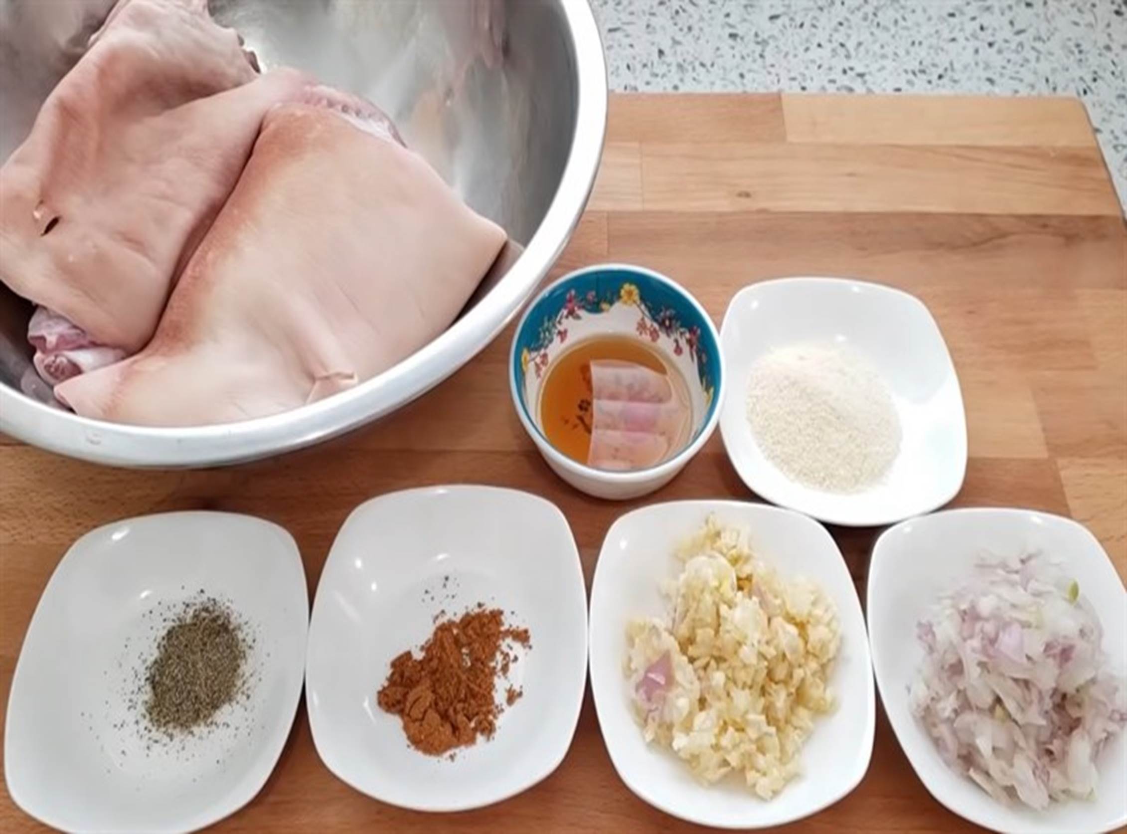 - Pha 1 muỗng canh giấm hoà đều với 1 muỗng cà phê baking soda, thoa đều lên bề mặt da của chân giò. Cuối cùng áo một lớp bột bắp thật mỏng bên ngoài phần chân giò.