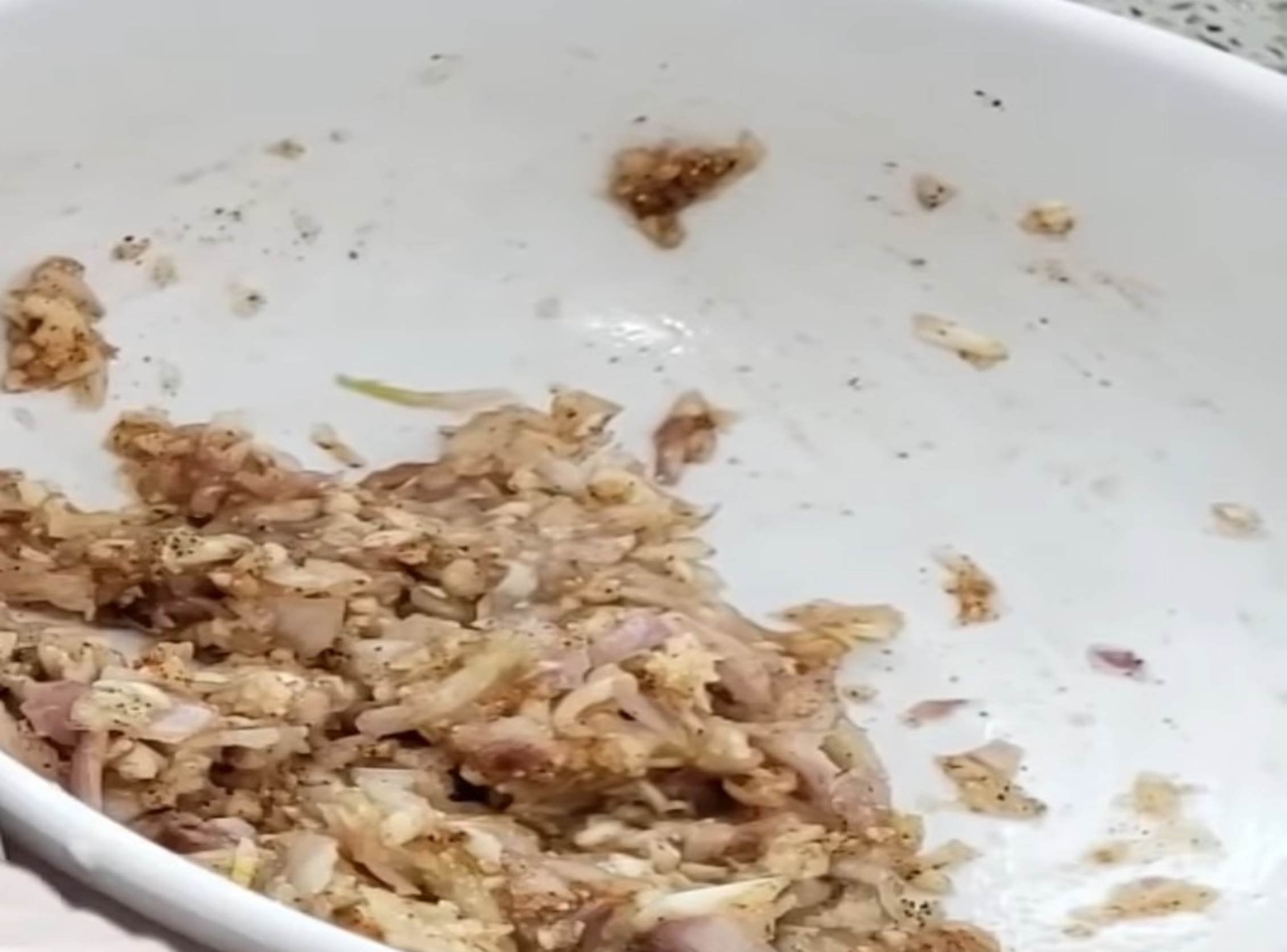- Cho 2 muỗng canh hành tím, 2 muỗng canh tỏi băm, 1/2 muỗng cà phê tiêu, 1 muỗng canh bột súp gà, 1/2 muỗng cà phê ngũ vị hương và 1 muỗng canh nước mắm vào chén và trộn đều.